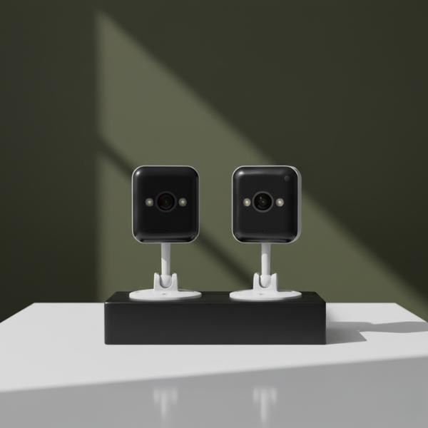• Two white and black security cameras are standing side-by-side on a matte black rectangular block. The background is a dark olive green wall with a prominent soft shadow cast by a window or object.
