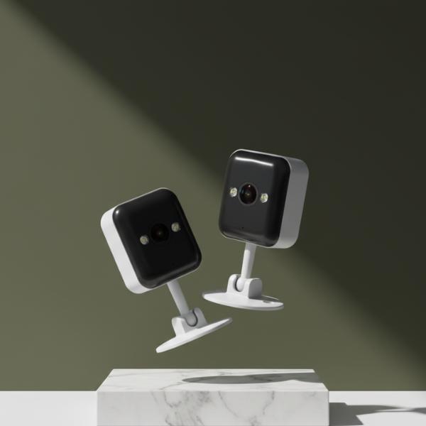 • Two white and black security cameras are levitating in mid-air at an angle above a square white marble block. The background is a solid olive green color.
