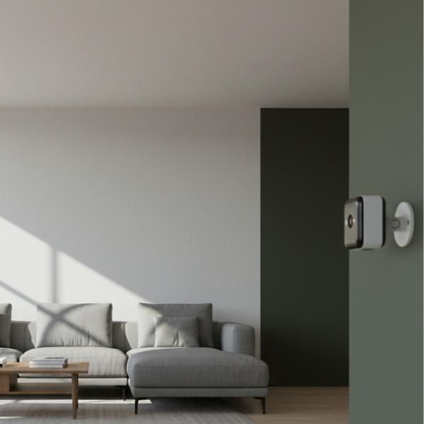 • A white and black security camera is mounted on a wall column, overlooking a modern living room interior with a gray sofa and minimal decor, showcasing its use as an interior security monitor.