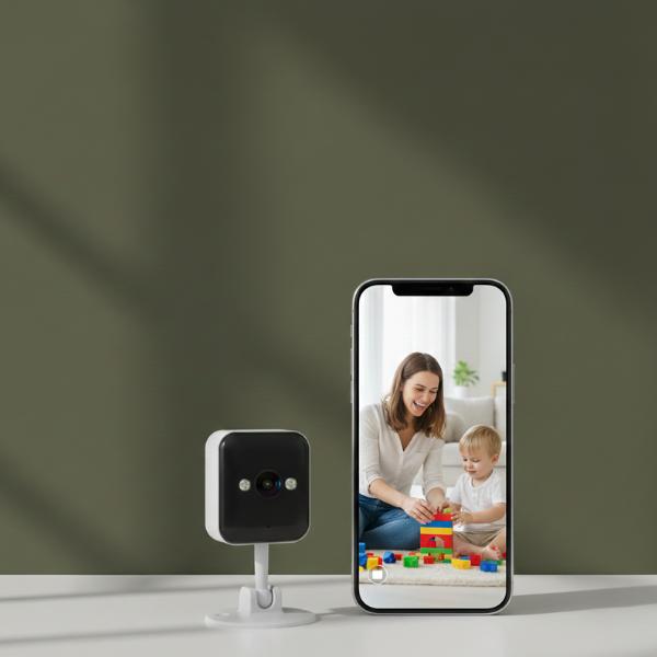 • : A white and black security camera is positioned next to a smartphone. The phone screen displays a live 4K feed of a mother and her son playing together with toys, demonstrating remote viewing capability.