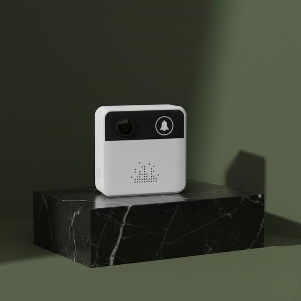 • A hero product image of the white and black smart video doorbell sitting on a glossy black marble block. The background is a dark olive green wall with soft shadows, creating a sophisticated and aesthetic presentation.