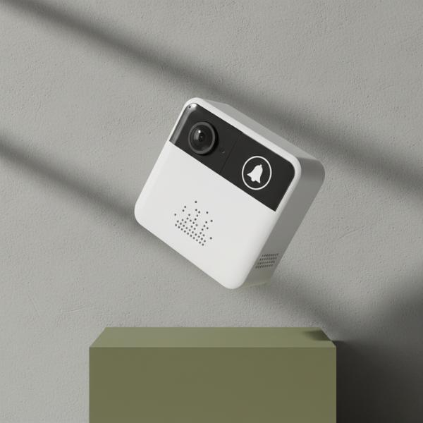 • The smart video doorbell is shown levitating mid-air, rotated 45 degrees to the right, above a matte olive green block. The background is a grey textured wall with dramatic soft shadows, presenting the product in a dynamic and clean aesthetic.