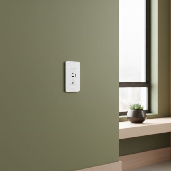 • A white smart plug with USB ports is installed on an olive green wall, viewed from a 45-degree angle, highlighting its slim profile against the wall.