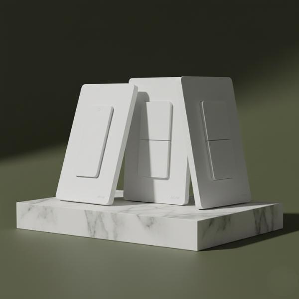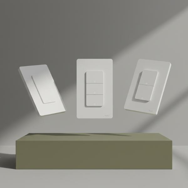 • Three white smart switches (one-gang, two-gang, three-gang) are levitating and angled over a matte olive green block with a gray background.