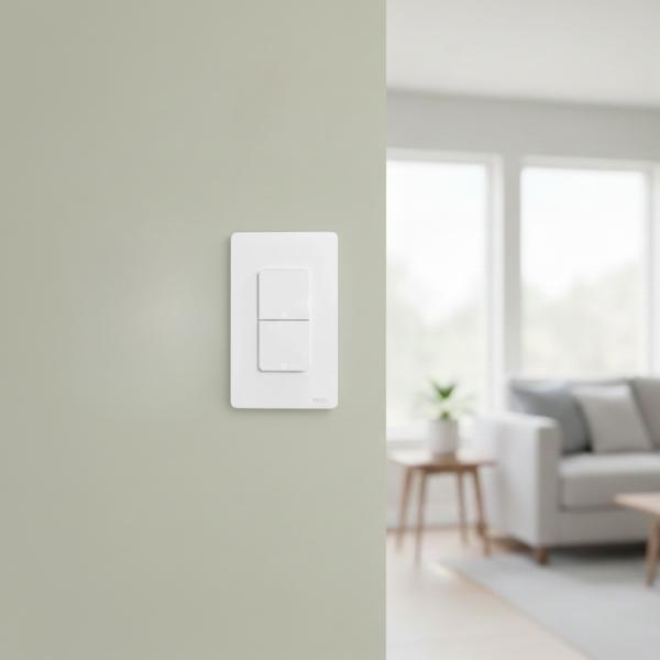 • A white two-gang smart switch is installed on a light olive green wall in a blurred modern living room interior.