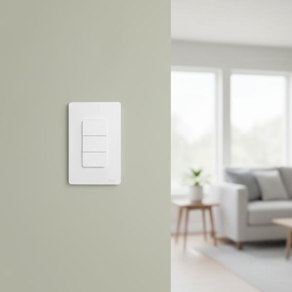 • A white three-gang smart switch is installed on a light olive green wall in a blurred modern living room interior.